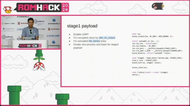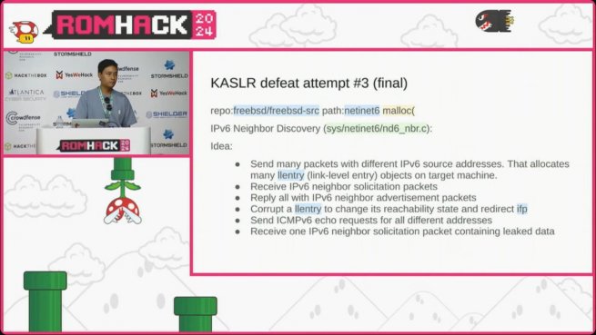 Andy Nguyen, après une référence à Specter et à la PS Vita, est revenu aussi sur le fait qu'il ne joue pas à des jeux, que son objectif est de trouver des failles dans la sécurité des systèmes, que c'est pour lui un passe-temps comme un autre, que ce n'est pas son travail principal, et qu'il publiera les sources de sa présentation, même si nous avons pu tout découvrir hier lors de la RomHack 2024 (intervention à partir de 7h10 jusqu' à la fin).